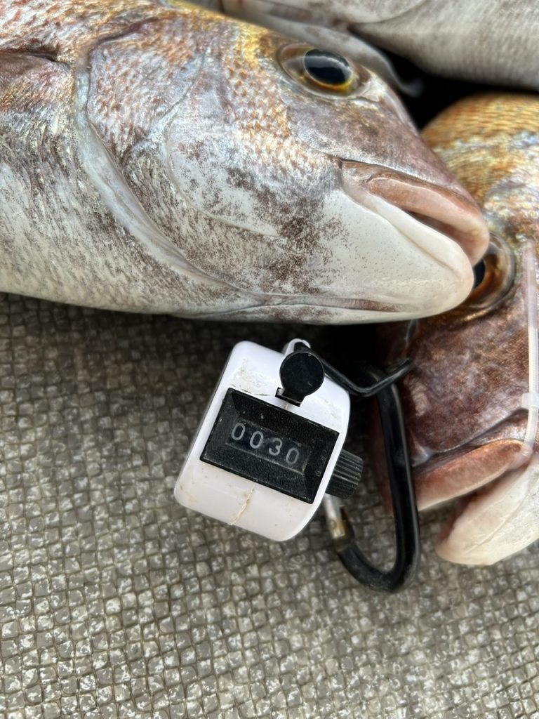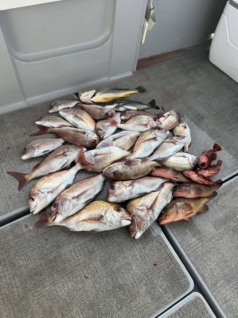 トップ14枚、船中鯛30枚(リリース含む)他、チヌ、アコウ、ガシラ、ニベ等10匹釣れました。