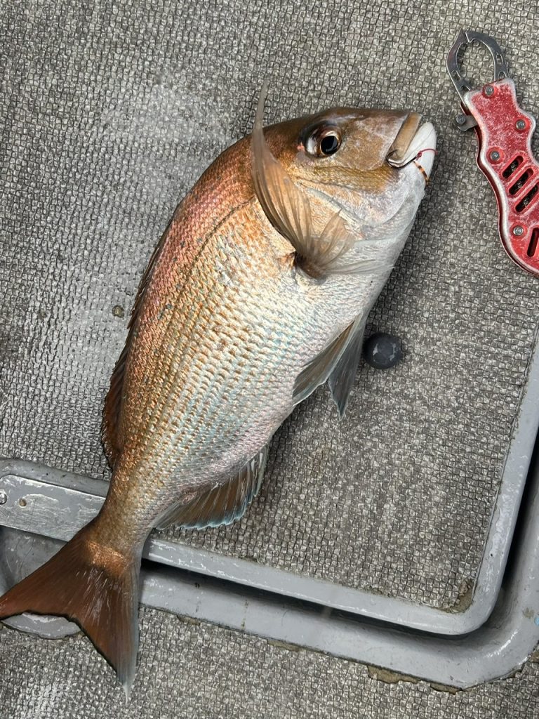シーバスが入れ食い状態になって潮が緩むと鯛ポイントでショートバイトの中、何とか釣ってくれました。